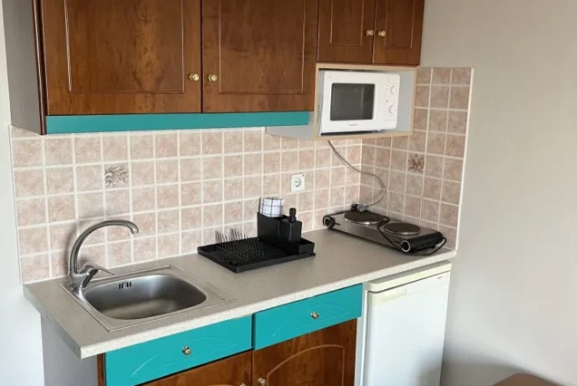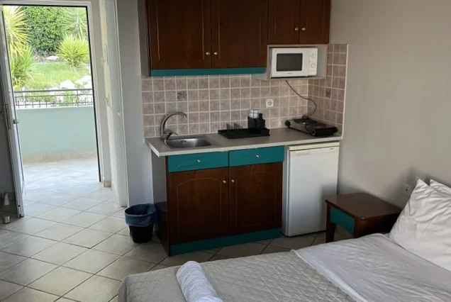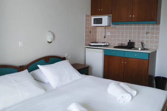 Studiji poseduju potpuno opremljenu kuhinju: fižider, mikrotalasna pećnica, posudje i čaše za dve osobe, toster, električni cajnik. Novo kupatilo sa tušem, sef koji se nalazi u ormaru i fen za kosu. Svi studiji poseduju sopstvenu terasu opremljenu sa setom stolica i kafe stolom. Balkonska vrata imaju ugradjen komarnik. U vili nudimo 1/2 studije za dve osobe i 1/3 studio za tri osobe. Studiji poseduju TV i klima uredjaje (uz doplatu 8e/dan) i Wi-Fi. Posteljina se menja na svakih pet dana. Po ulasku u studio gosti dobijaju set peškira, veliki i mali peškir po osobi (dva velika i dva mala peškira). Čistoću studija održava sam korisnik. Vila je opremljena novim nameštajem i naša je preporuka za ugodan odmor.