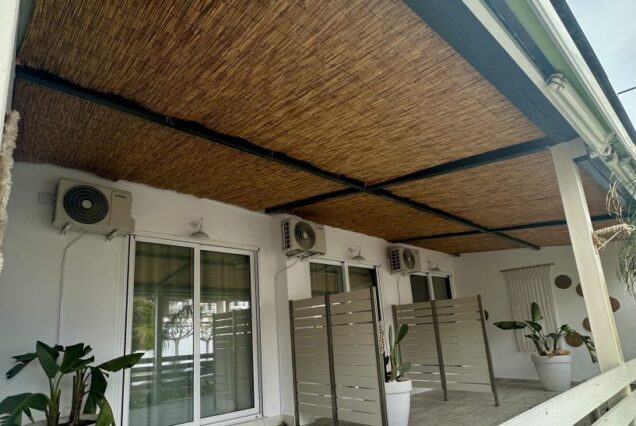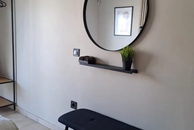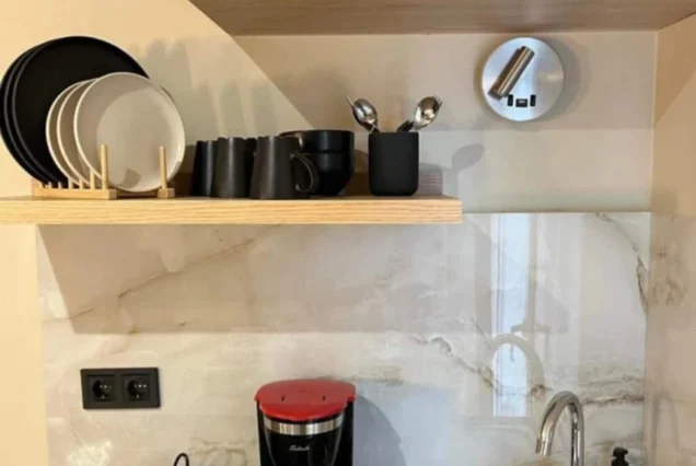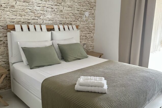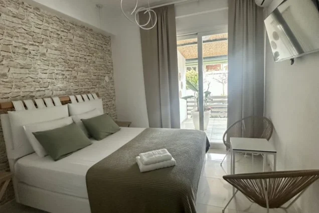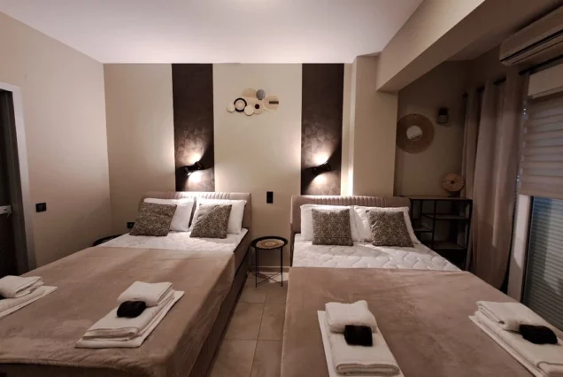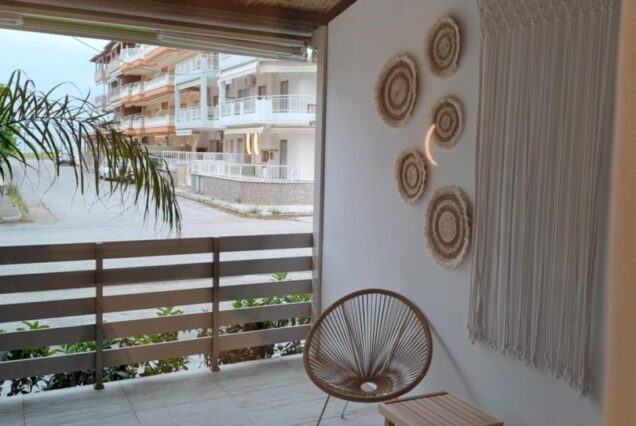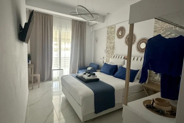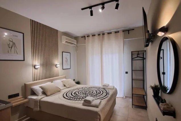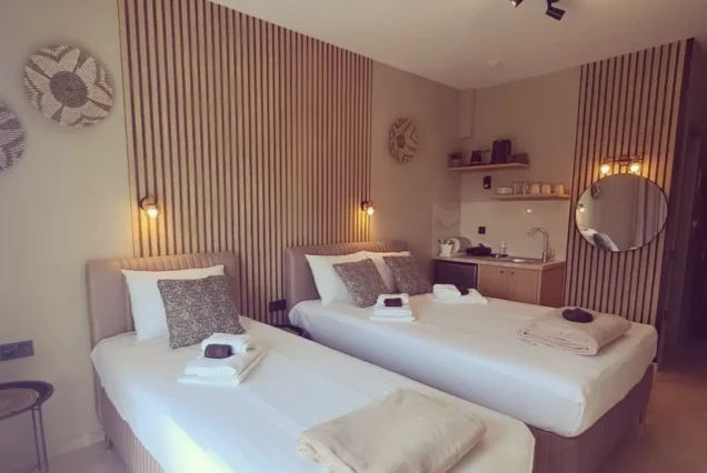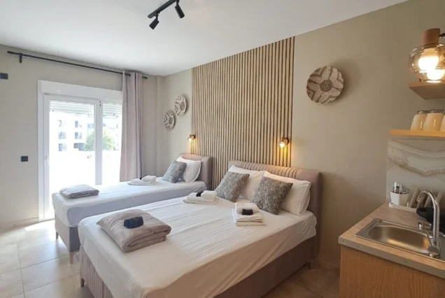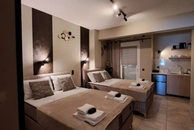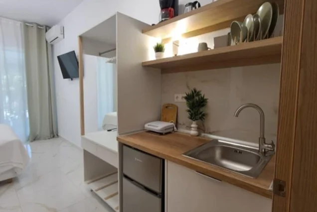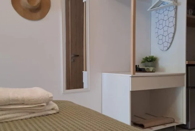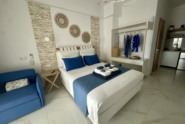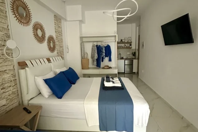Svaka smeštajna jedinica je opremljena modernim nameštajem i nudi delimičan pogled na more i planinu Olimp. Poseduje operemljenu čajnu kuhinju sa električnim kuvalom za vodu i kafu, tosterom i mini frižiderom. U kuhinjama nije dozvoljeno kuvanje i one ne sadrže ringle. Kupatila su kompletno opremljena, sadrže i fen za kosu. Svi studiji poseduju SMART TV, Wi-Fi internet, peglu, dasku za peglanje i klima uređaj čija se upotreba dodatno naplaćuje 5€ dnevno. Peškiri su sastavni deo studija, a čistoću smeštajne jedinice održava sam korisnik. Posteljina se menja 5. dana boravka.